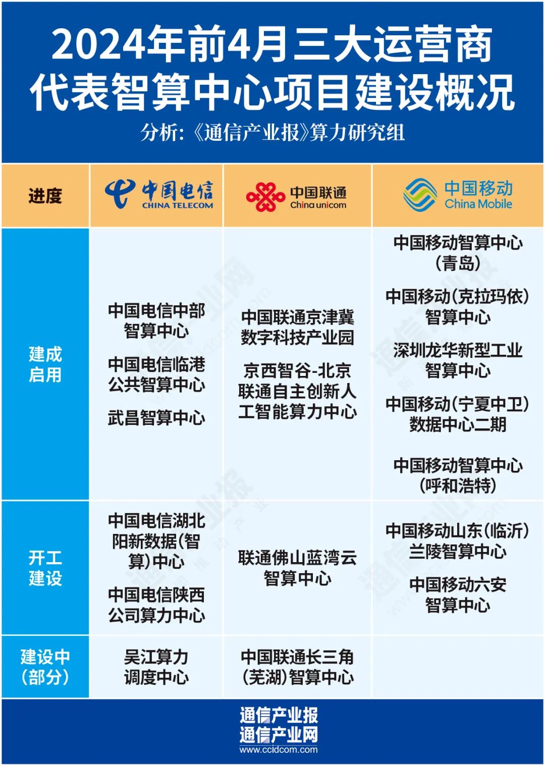据不完全统计,今年前四个月,三大运营商建成投产的智算中心共有10座,开工建设智算中心共有5座,另有若干个项目在建。