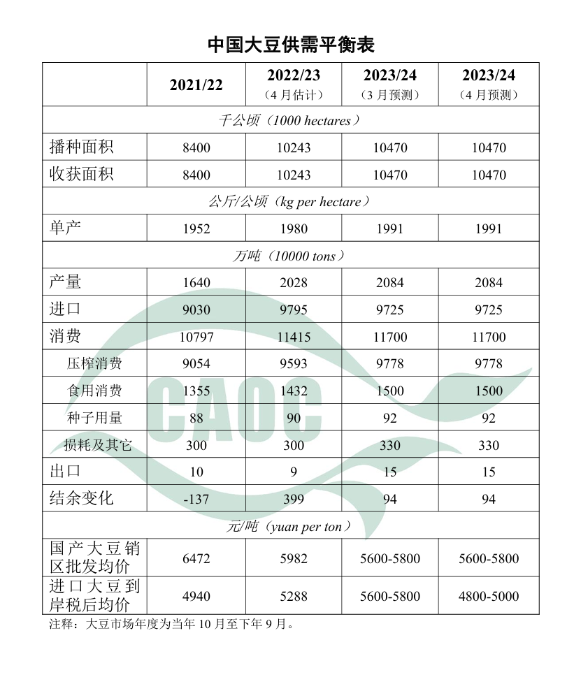 本月对2023/24年度中国大豆供需形势预测与上月保持一致。国内方面,当前春播正在由南向北有序展开,在一揽子稳定大豆生产政策支持下,农户种植意向有所好转。随着九三集团等持续收购,农户出售大豆进度明显加快,价格平稳运行。国际方面,预计美国大豆库存和种植面积均高于上年度成都黄金期货配资,南美丰产预期强烈,全球大豆供给维持宽松格局。