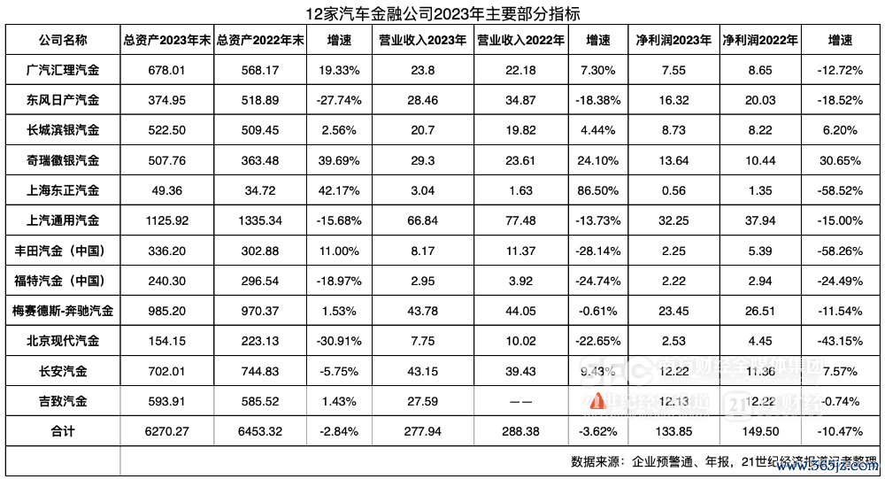 记者梳理,截至目前,已有12家汽车金融公司发布了2023年年报。统计结果显示,截至2023年末,这12家汽车金融公司总资产为6270.27亿元,较2022年末下降2.84%;全年营业收入合计为277.94亿元(为同比,不含吉致汽车金融),较2022年下降3.62%;净利润为133.85亿元,较2022年下降10.47%。